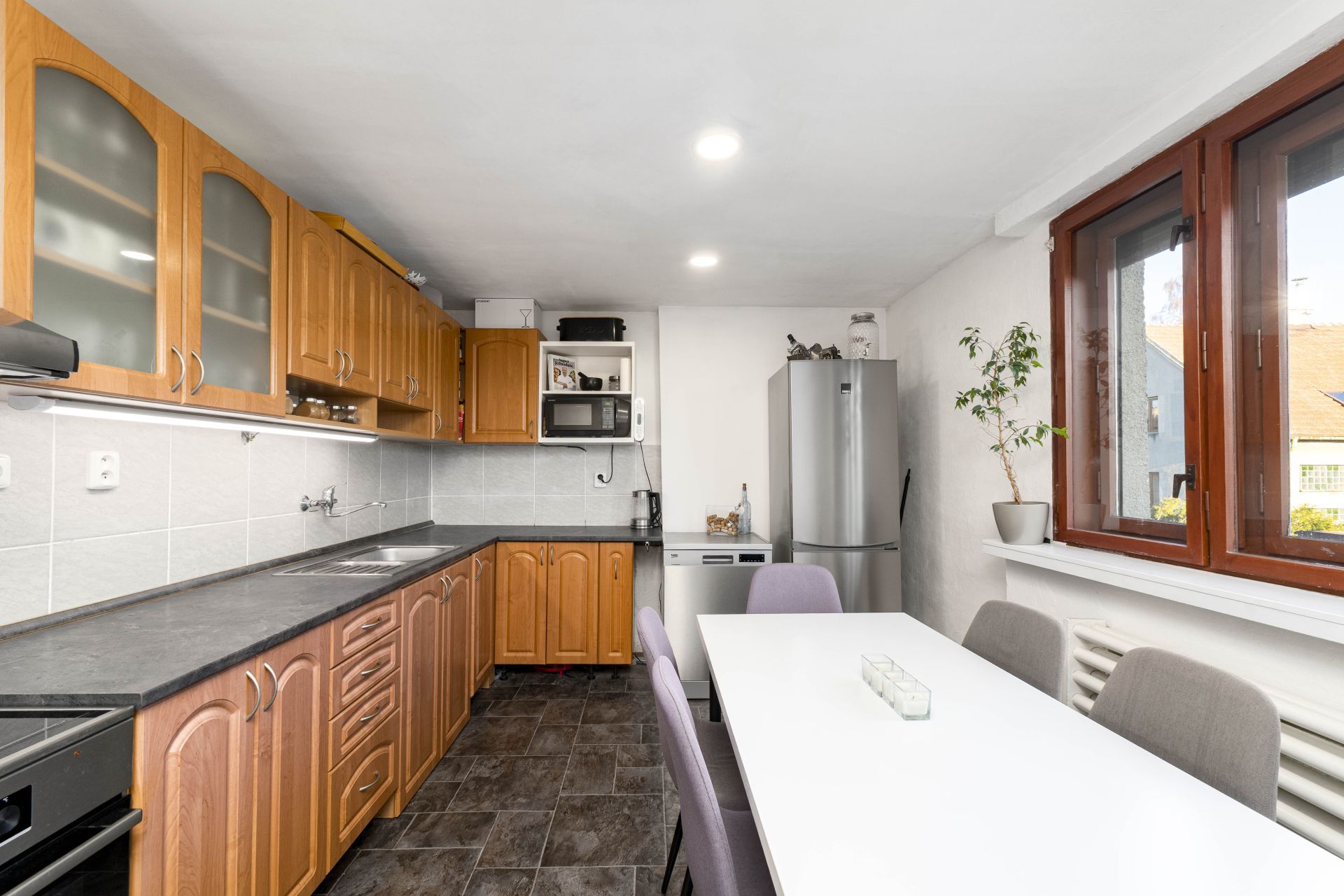 V kuchyni najdete rohovou kuchyňskou linku a místo na jídelní stůl. Na tuto část navazuje ložnice se vstupem do šatny. Dále zde najdete obývací pokoj a samostatnou pracovnu.